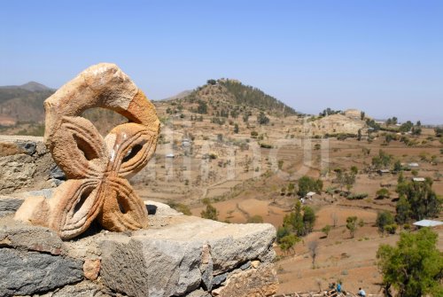 Ancient window in the shape of a crossflower with wide view into the landscape at church Abba Pantaleon Axum Ethiopia