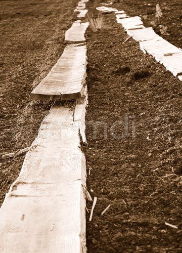 Weathered planks formerly used to hold rails of mining railraod in open pit peat mining
