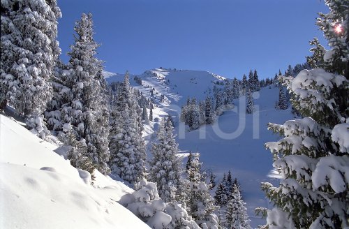 Fur-trees after the first snow in mountains. Mountains Zailisky Alatau, Almaty area, Kazakhstan.