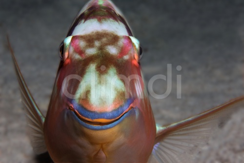 Sleeping and smiling Longnose Parrotfish (Hipposcarus harid) at night, Abau Dabab reef, Hurghada, Red Sea, Egypt, Africa