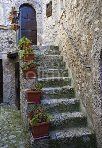 Stairs with a door and flower pots, Santa Stefano de Sessiano, Abbruzzies, Abruzzo, Italy, Europe