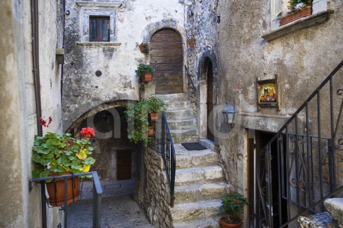 Back yard with stairs, doors and flowers, Santa Stefano de Sessiano, Abbruzzies, Abruzzo, Italy, Europe