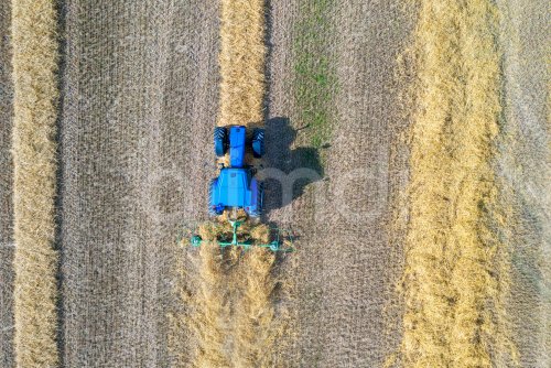 Blue tractor with rotary hay tedder, farming machine used in haymaking for tedding hay, aerate or wuffle the hay, preventing mildew or fermentation