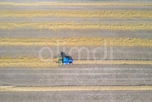 Blue tractor with rotary hay tedder, farming machine used in haymaking for tedding hay, aerate or wuffle the hay, preventing mildew or fermentation