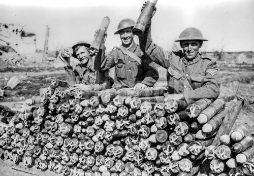 1917 British WWI artillery soldiers posing with field gun shells during World War One at Zillebeke, West Flanders, Belgium