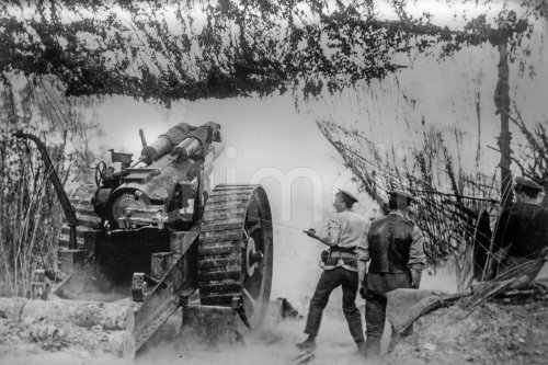 1916 British WWI artillery soldiers firing heavy 8-inch howitzer field gun during World War One at Wagnonlieu near Arras, Pas-de-Calais, France