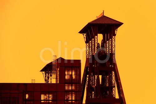 Colliery headframe / hoist frame and coal mine building in the coal mining town Beringen at sunset, Koersel, province of Limburg, Flanders, Belgium