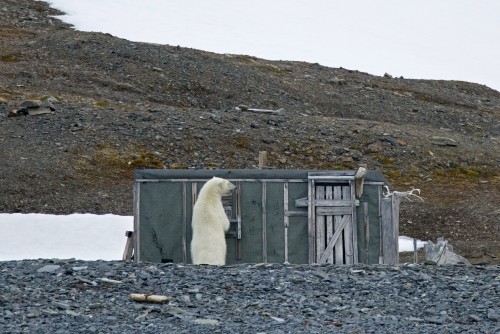 Curious polar bear (Ursus maritimus) examining old abandoned fur trapper cabin along the Svalbard coast, Spitsbergen, Norway