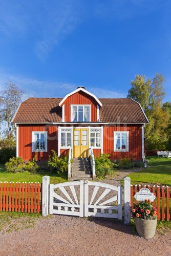 Katthult, red wooden farm house with fence from Astrid Lindgren's tales about Emil of Lönneberga at Gibberyd near Rumskulla, Vimmerby, Småland, Sweden