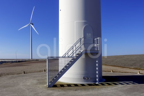 Entrance door to wind turbine tower at wind park / windfarm at Neeltje Jans, Eastern Scheldt storm surge barrier in Zeeland, Netherlands