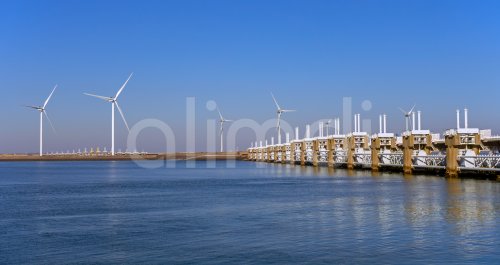 Movable barrier sections of the storm flood barrier / Oosterscheldekering / Eastern Scheldt storm surge barrier at Neeltje Jans, Zeeland, Netherlands