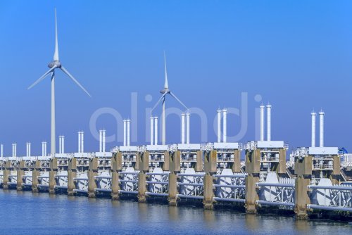 Movable barrier sections of the storm flood barrier / Oosterscheldekering / Eastern Scheldt storm surge barrier at Neeltje Jans, Zeeland, Netherlands