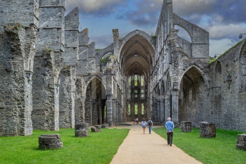 Tourists visiting church ruins at the 13th century Abbaye de Villers, former Cistercian abbey in the town Villers-la-Ville, Walloon Brabant, Belgium