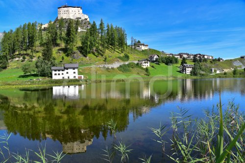 Tarasp Castle in the Lower Engadine reflected in Lake Tarasp, Graubünden, Switzerland, Europe