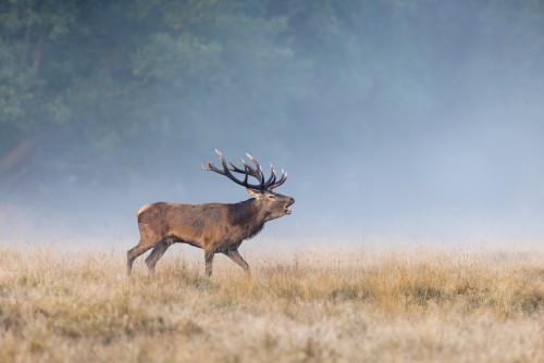 Red deer (Cervus elaphus) stag with big antlers bellowing in grassland at edge of forest in early morning mist at dawn during the rut in autumn