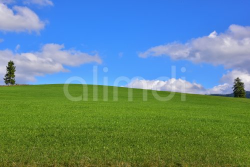 Two single spruce trees on an agricultural pasture in the Allgäu region, Bavaria, Germany, Europe