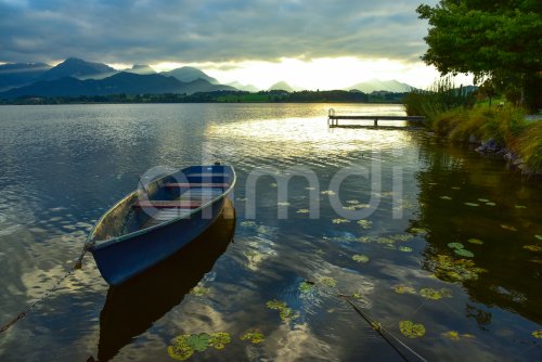 Rowing boat on Lake Hopfen in the Allgäu at sunset in Hopfen am See, Bavaria, Germany, Europe