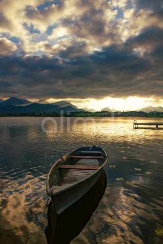 Rowing boat on Lake Hopfen in the Allgäu at sunset in Hopfen am See, Bavaria, Germany, Europe