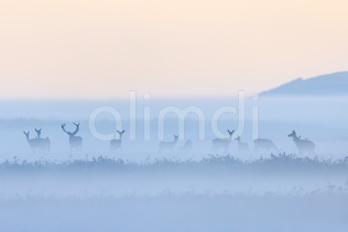 Red deer stag herding herd of hinds in morning mist along the Baltic Sea, Western Pomerania Lagoon Area NP, Mecklenburg-Western Pomerania, Germany