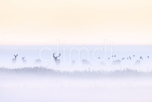 Red deer stag herding herd of hinds in morning mist along the Baltic Sea, Western Pomerania Lagoon Area NP, Mecklenburg-Western Pomerania, Germany