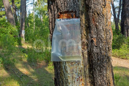 Collecting resin from Aleppo pine tree in plastic bag for flavouring the resinated wine retsina on Greek peninsula Chalkidiki / Chalcidice, Greece