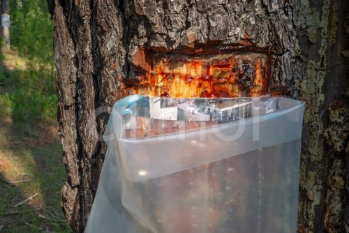 Collecting resin from Aleppo pine tree in plastic bag for flavouring the resinated wine retsina on Greek peninsula Chalkidiki / Chalcidice, Greece