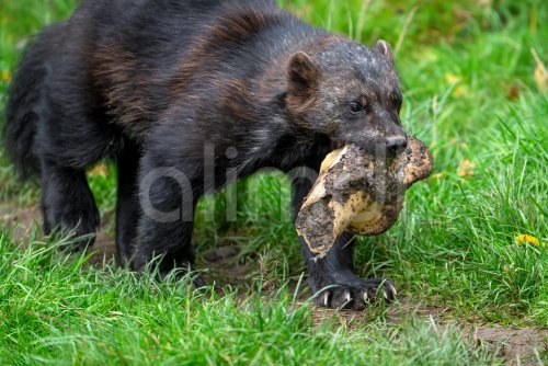 Scavenging wolverine / glutton / carcajou (Gulo gulo) walking away with huge animal bone, native to Scandinavia, Russia, Siberia, Canada and Alaska