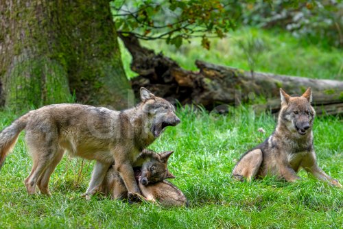 Wolf pack of Eurasian wolves / European grey wolves (Canis lupus lupus) with 5 months old pups play fighting in forest / woodland in autumn