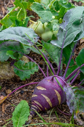 Kohlrabi / German turnip / turnip cabbage (Brassica oleracea var. gongylodes) in vegetable garden in autumn / fall