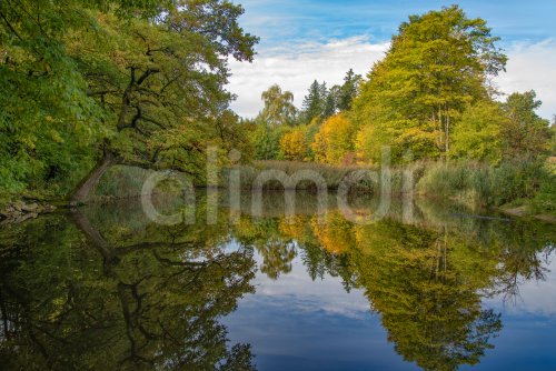 Pond at the edge of an autumnally colorful forest, Bavaria, Germany, Europe