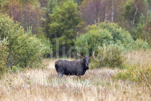 Moose / elk (Alces alces) bull / male foraging in grassland at edge of forest in autumn / fall, Sweden, Scandinavia