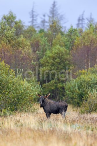 Moose / elk (Alces alces) bull / male foraging in grassland at edge of forest in autumn / fall, Sweden, Scandinavia