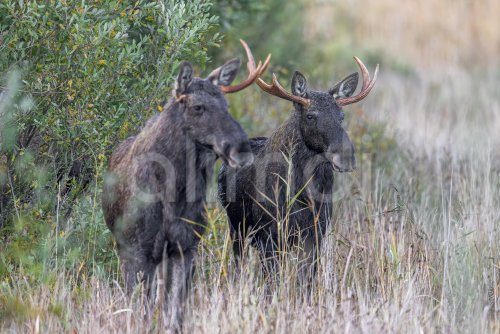 Moose / elk (Alces alces) two young bulls / males, one with shed antler in grassland at edge of forest in autumn / fall, Sweden, Scandinavia