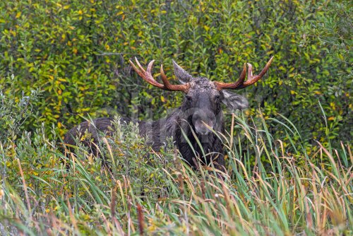 Moose / elk (Alces alces) bull / male feeding on willow leaves in marshland in autumn / fall, Sweden, Scandinavia