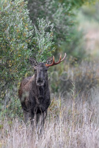 Moose / elk (Alces alces) young bull / male shedding antlers in grassland at edge of forest in autumn / fall, Sweden, Scandinavia