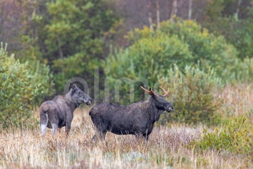 Moose / elk (Alces alces) two young bulls / males, one with shed antlers in grassland at edge of forest in autumn / fall, Sweden, Scandinavia