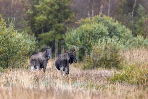 Moose / elk (Alces alces) two young bulls / males, one with shed antlers in grassland at edge of forest in autumn / fall, Sweden, Scandinavia