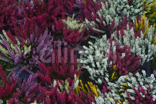 Flowering heathers in a rich palette of deep wine red, bright magenta, soft violet, brilliant white and bright yellow