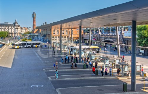 Commuters waiting for transit buses at bus stop of public transport company De Lijn at train station Gent-Sint-Pieters, Ghent, East Flanders, Belgium
