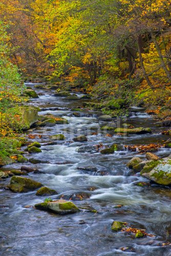 River Bode running through forest showing autumn colours / fall colors at Nature reserve Bode Valley in the Harz Mountains, Saxony-Anhalt, Germany