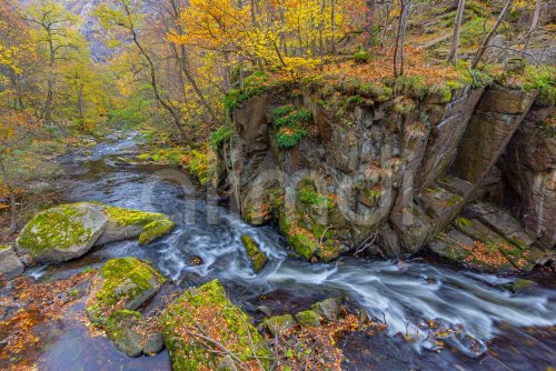 River Bode running through forest showing autumn colours / fall colors at Nature reserve Bode Valley in the Harz Mountains, Saxony-Anhalt, Germany