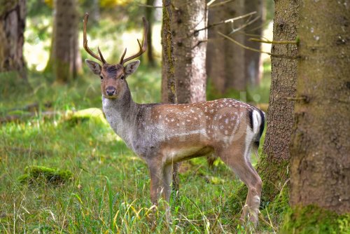 Fallow deer with magnificent antlers (Dama dama) in an autumnal forest in Bavaria, Germany, Europe