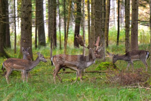 Fallow deer with magnificent antlers (Dama dama) in an autumnal forest, surrounded by its herd of hinds, Bavaria, Germany, Europe