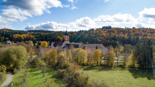 Aerial view of the Cistercian Abbey of Oberschönenfeld in the Augsburg Western Forests Nature Park, Swabia, Bavaria, Germany, Europe