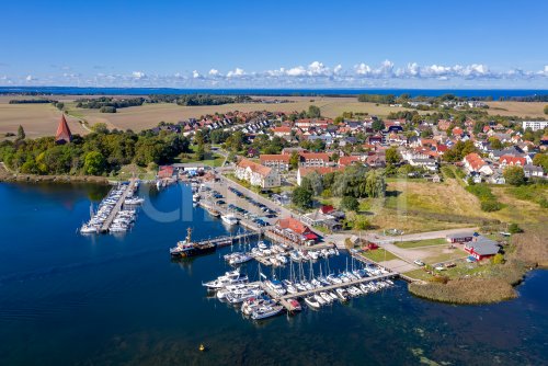 Aerial view over sailing boats in the harbour / marina of the village Kirchdorf in the Bay of Greifswald, Sundhagen, Mecklenburg-Vorpommern, Germany