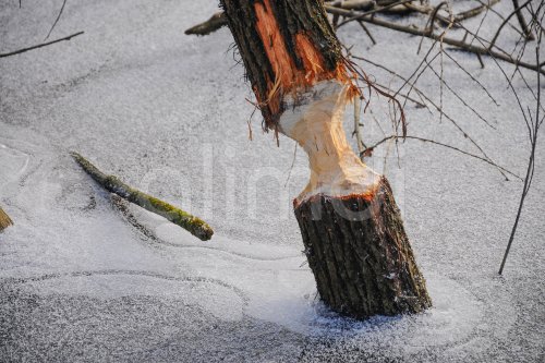 Gnawing marks of a beaver (Castoridae) on a tree trunk in a frozen body of water in Bavaria, Germany, Europe