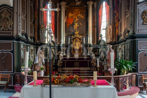 12th century Church of Our Lady / Onze-Lieve-Vrouwekerk interior in the village Wulveringem in autumn / fall, Veurne, West Flanders, Belgium