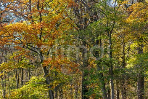 European beeches / common beech trees (Fagus sylvatica) with foliage in yellow, brown and green autumn colours / fall colors in broadleaved forest