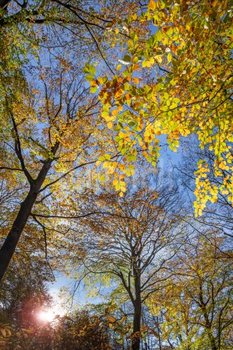 European beeches / common beech trees (Fagus sylvatica) with foliage in yellow and brown autumn colours / fall colors in broadleaved forest