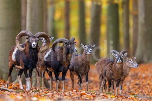 European mouflons (Ovis aries musimon / Ovis gmelini musimon), herd with rams / males, ewes / females and juveniles in forest during the rut in autumn